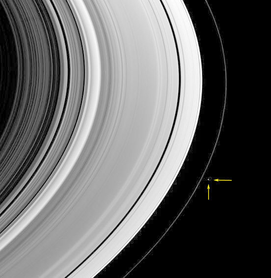 Qui sotto, il satellite pastore Pandora mentre "pattuglia" il bordo dell'anello, Fonti NASA/JPL Cassini/Huygens mission |