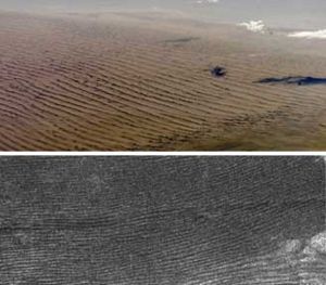 Confronto fra le dune terrestri (sopra) e quelle di Titano (sotto) |