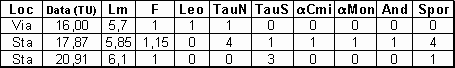 Legenda: Via= Viareggio; Sta= Stazzema (osservatorio Alpi Apuane); Leo= leonidi; Tau N-S = tauridi nord-sud; aCmi= alfa caneminoridi; aMon= alfa monocerontidi; And= andromedidi. Altre diciture come nelle tabelle precedenti.