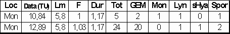 Legenda: GEM= geminidi; Mon= monocerontidi; Lyn= lyncidi; sHya= sigma idridi. Altre diciture come nelle tabb. precedenti.