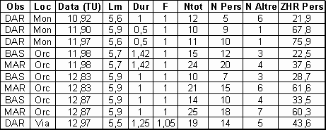 La legenda della tabella è la seguente: Obs = osservatore (DAR=D’Argliano, BAS=Bassetti, MAR=Martini); Loc = località di osservazione (Mon=Montigiano, Orc=Orciano Pisano, Via=Viareggio); Data (TU) = tempo di inizio di osservazione in TU espresso in giorno e decimale; Lm = magnitudine limite media; Dur = durata osservazione (ore e decimali); F = fattore correttivo per ostacoli (1= cielo libero da ostacoli); Ntot = numero totale di meteore osservate di cui N Pers = perseidi e N altre = meteore di altri sciami e sporadiche; ZHR Pers = Tasso Orario Zenitale corretto per le Perseidi.