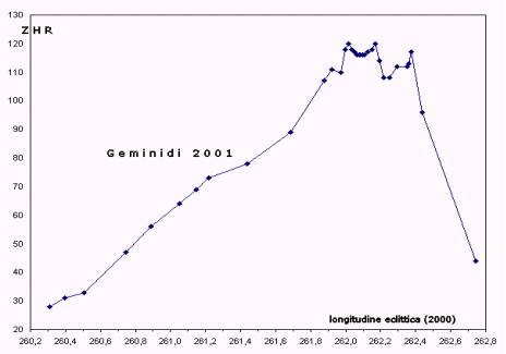 Il grafico comprende i dati osservativi di 44 osservatori di tutto il mondo, che in oltre 146 ore hanno registrato 5919 Geminidi. Lo sciame ha mostrato un massimo molto piatto e largo, a livelli di circa 120 meteore/ora per parecchio tempo, come minimo dalle 23h alle 3h30m TU. I due picchi massimi leggibili nel grafico indicano all'incirca le 23h45m TU (long.eclittica 262,014°) e le ore 3h15m TU (long.eclittica 262,17°).